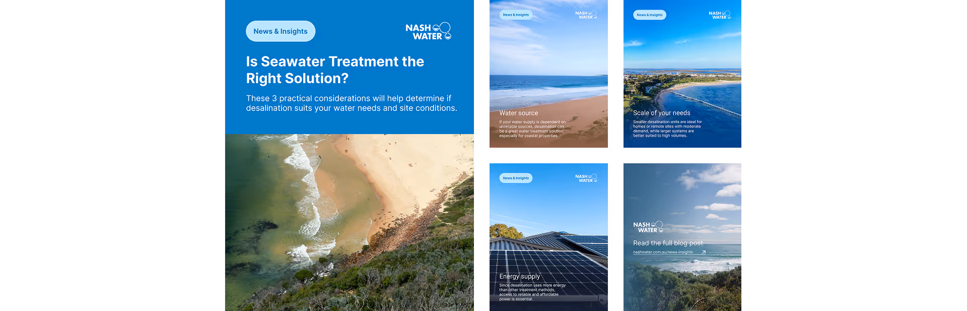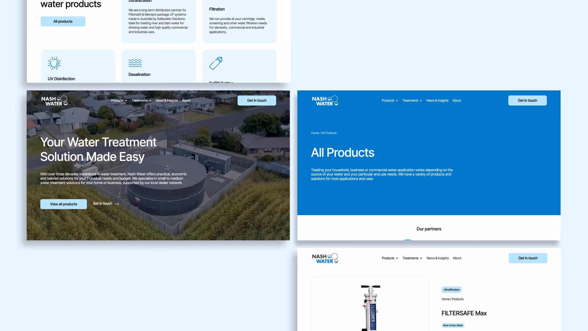 Nash Water is a Melbourne-based water treatment specialist, offering practical, economic and tailored solutions for clients' individual needs and budget. Supported by a trusted national dealer network, the business has built a strong reputation for their technical expertise and straightforward advice. While Nash Water’s offering was well-regarded, they lacked digital presence which left their deep industry expertise unrepresented and prospective clients without a platform to engage with complex product information.